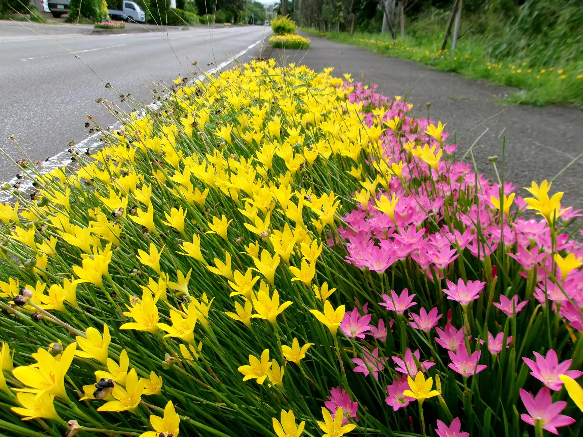 写真はよく来る浦内のやまねこ宅配さんの無人売店の向かいの花壇に咲く2色のタマスダレです。